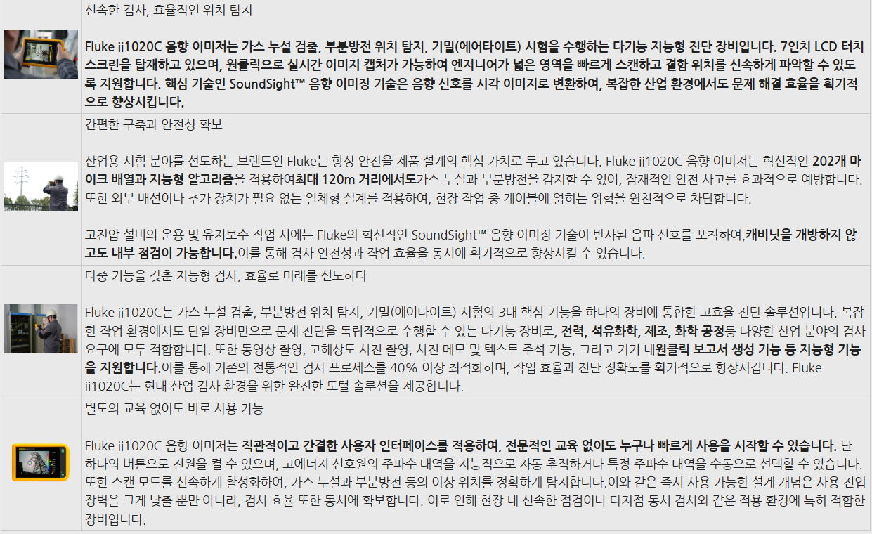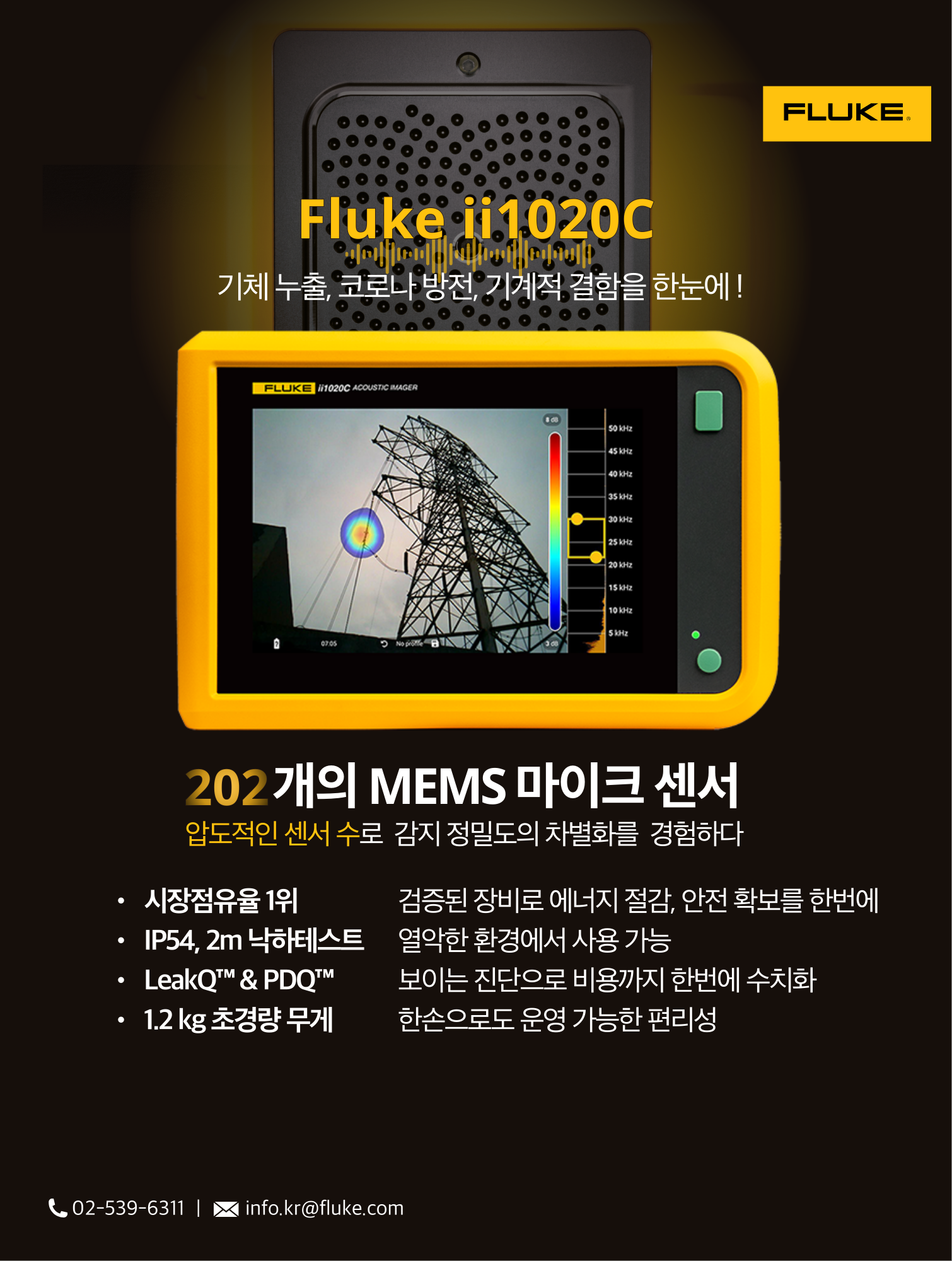Fluke ii1020C 는 가스 누설, 부분방전 및 기밀(에어타이트) 검출 분야의 전문가용 음향 이미저입니다.