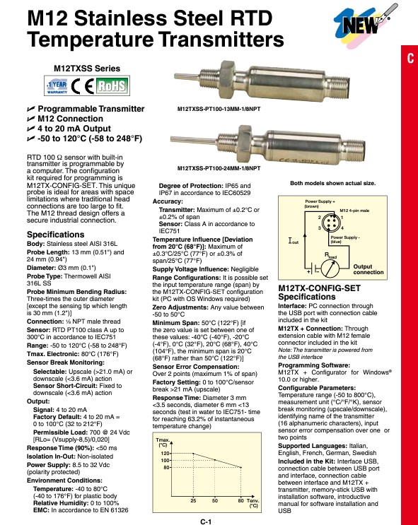 범위 설정: M12TX-CONFIG 설정 키트에서 입력 온도 범위 (span) 설정 가능 (Windows 설치된 PC 필요)